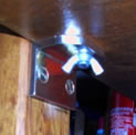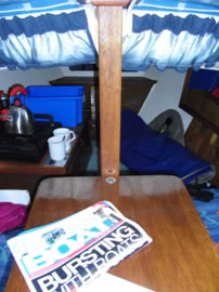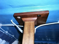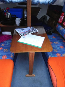 Saloon Table Having successfully completed the anti compression post I was asked if I could design and make a small saloon table and thought to make use of the plywood left over from the new floorboards. I discussed with Gerry my ideas which would incorporate a fitting attached to the new post which would allow the table to be attached or taken down for storage when not in use. The table top was cut and the corners rounded then hardwood edging applied to the flat parts of the edge and finally four pieces of brass strip were cut, drilled and bent to a former before being attached to each corner. Next a leg was made which is held in place by a long T hinge and to ensure the leg does not fold inward when in use a desk type stay was fitted. The leg is pulled downwards to its optimum position then the stay which folds, is opened and locks. From Metals South West in Newton Abbot I bought a 50mm long piece of 38 x38mm right angle solid brass one edge of which I rounded both corners and then drilled a central hole for an 8mm bolt. On the other face two holes were drilled and countersunk for screwing to the post. When the brass was ready I polished it to a high sheen. The bolt passes through the table top and down through the brass plate and is secured with a wing nut. To ensure even pressure on the wood of the table I glued a penny washer up under the head of the bolt using plastic steel. When the table is not in use it stows under the cushion at the foot end of one of the berths.